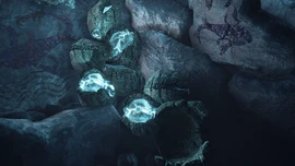 In this stage, the Arai are in a tough egg sac and are completely immobile. The eggs change color depending on the chemical makeup of the surfaces they are attached to.[2] In order to hatch, they must be in proximity of a polyarch, and are fertilized by the beetles after a certain stage of maturity. The luminosity of the eggs pulses in regular intervals. The pulsing is induced by the polyarchs.