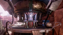The structure looks like a big blue metal water reservoir on top of an equally big Tesla coil, with massive cables and tubes protruding from underneath, where also a casing houses the main connector of the battery. The whole device is mounted on a metal platform with a walkway around it, all of which is set on metal supports anchored in the rocks below. Around the device are connected three Villein technology parts with tubes connecting underneath the platform.