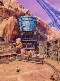 The battery is a large device which, early on in the game, C.W. asks the player to connect. It is located right next to C.W.'s workshop. A train bridge passes in front of it and leads to the central big Tree of Hunrath. On the side of the bridge tracks, we see heavy cable connectors of the same kind as the ones coming out of the battery. In Farley's journal, found much later in the game, Caroline Farley expresses her intention to sway C.W. from his "battery" plan.