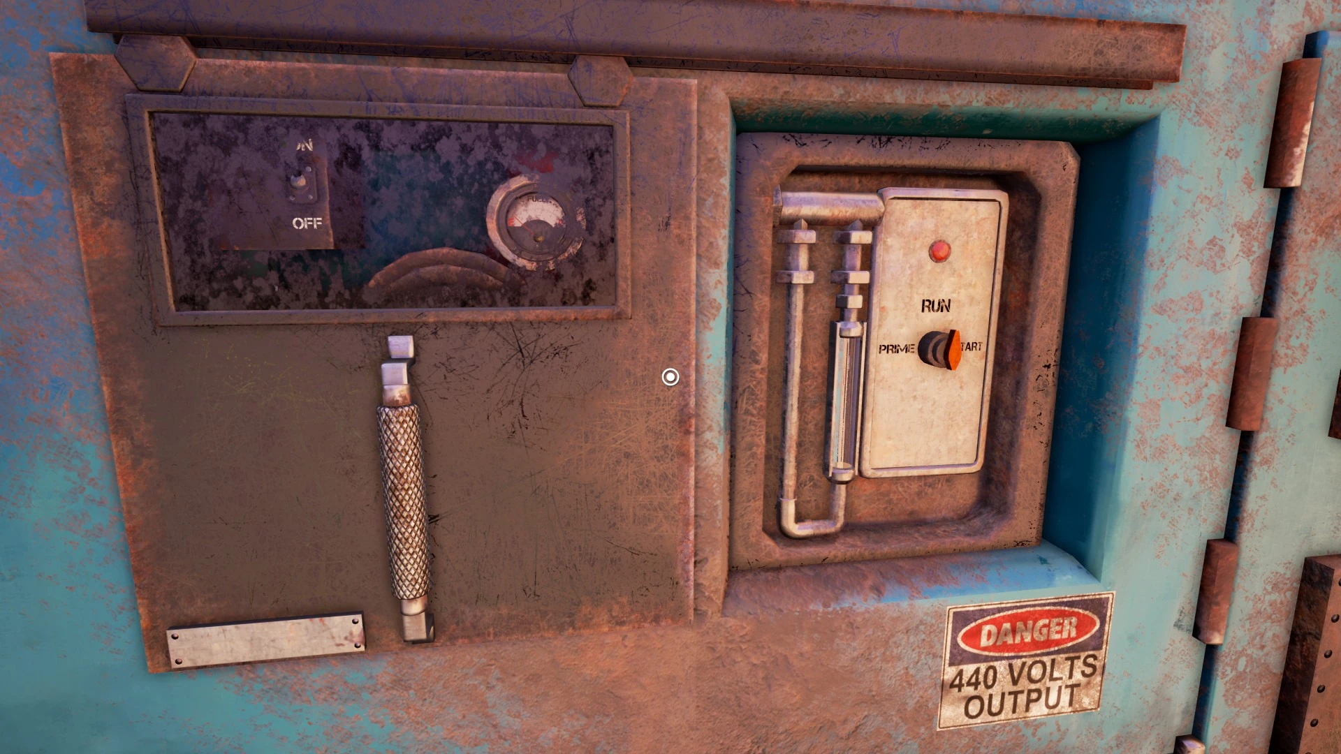 Most of the train carriages just contain junk, but there the blue one has a ramp leading up to it, and is connected to a hose and a thick bunch of cables. This is our generator. Head up the ramp to look at the controls.