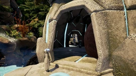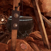 This rotator is found in the Mineshaft area of Hunrath and rotates one part of a swap pair of similar spheres of Villein technology, the other of which is located in Maray. Its rotating mechanism is also suspended on train wheel trolleys running on a railtrack. It is located at the bottom of the mine cavity with a wooden platform above it allowing access to the sphere. It is instrumental for solving the Gauntlet Maze Puzzle. Two buttons mounted on a level just above the rotating sphere can rotate the sphere either 90° clockwise (bottom) or anticlockwise (top).