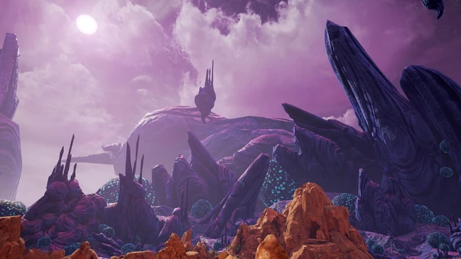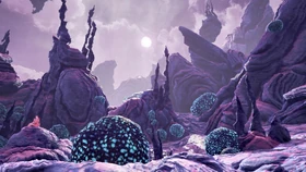 The world of Soria is rocky, with many floating rocks around. The rocks are purple and fairly smooth/shiny. The rocks all have some patterns of lines on their surfaces. The flora seems to be large dark blue spheres with bright blue spots, varying in size. You are able to see some small pillars that are red and flashing slightly, indicating that they were made by the Mofang.